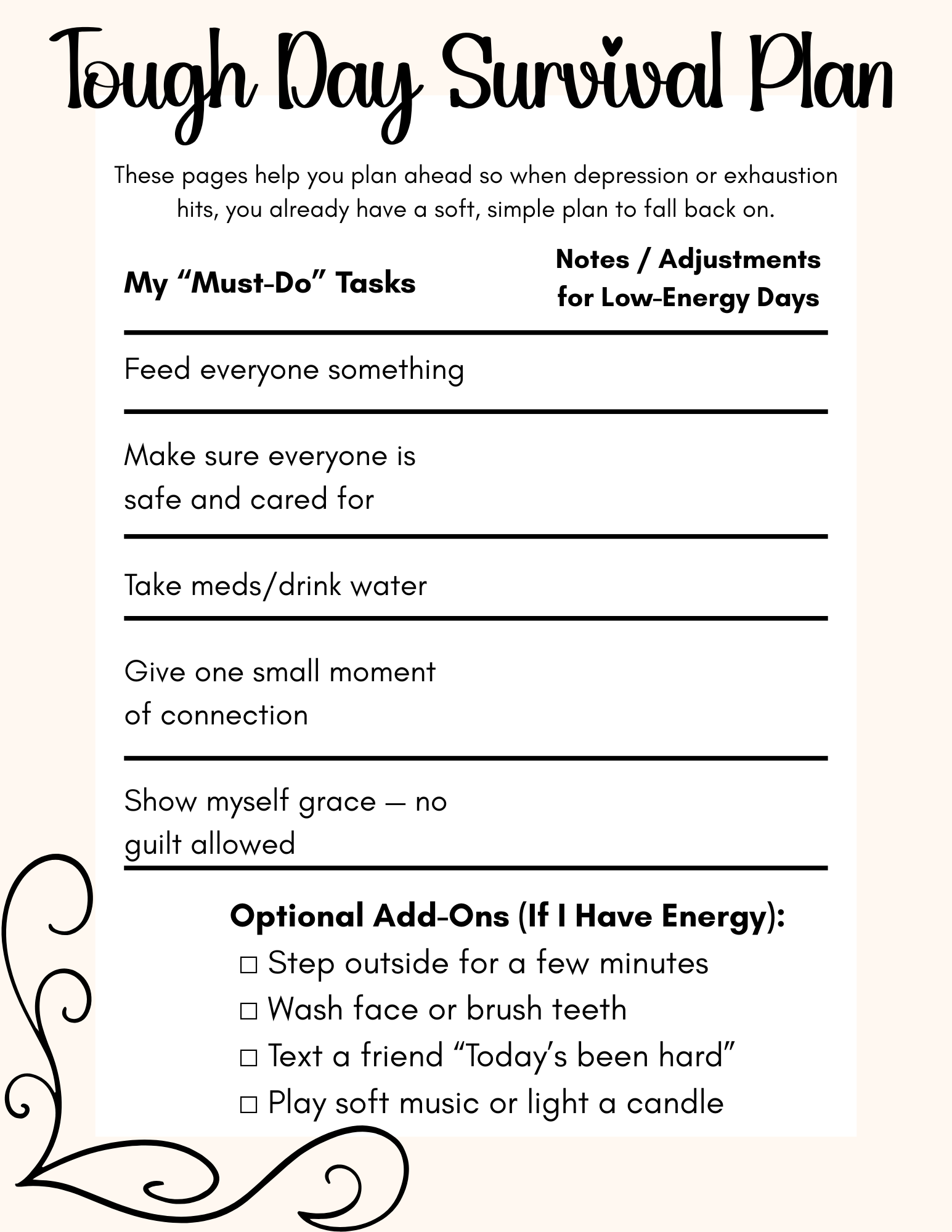 The Tough Day Survival Plan is a printable guide designed for moms living with depression or anxiety. It helps them identify early signs of tough days, set realistic goals, choose calming activities, and lean on supports to navigate challenging times with confidence and self-compassion.