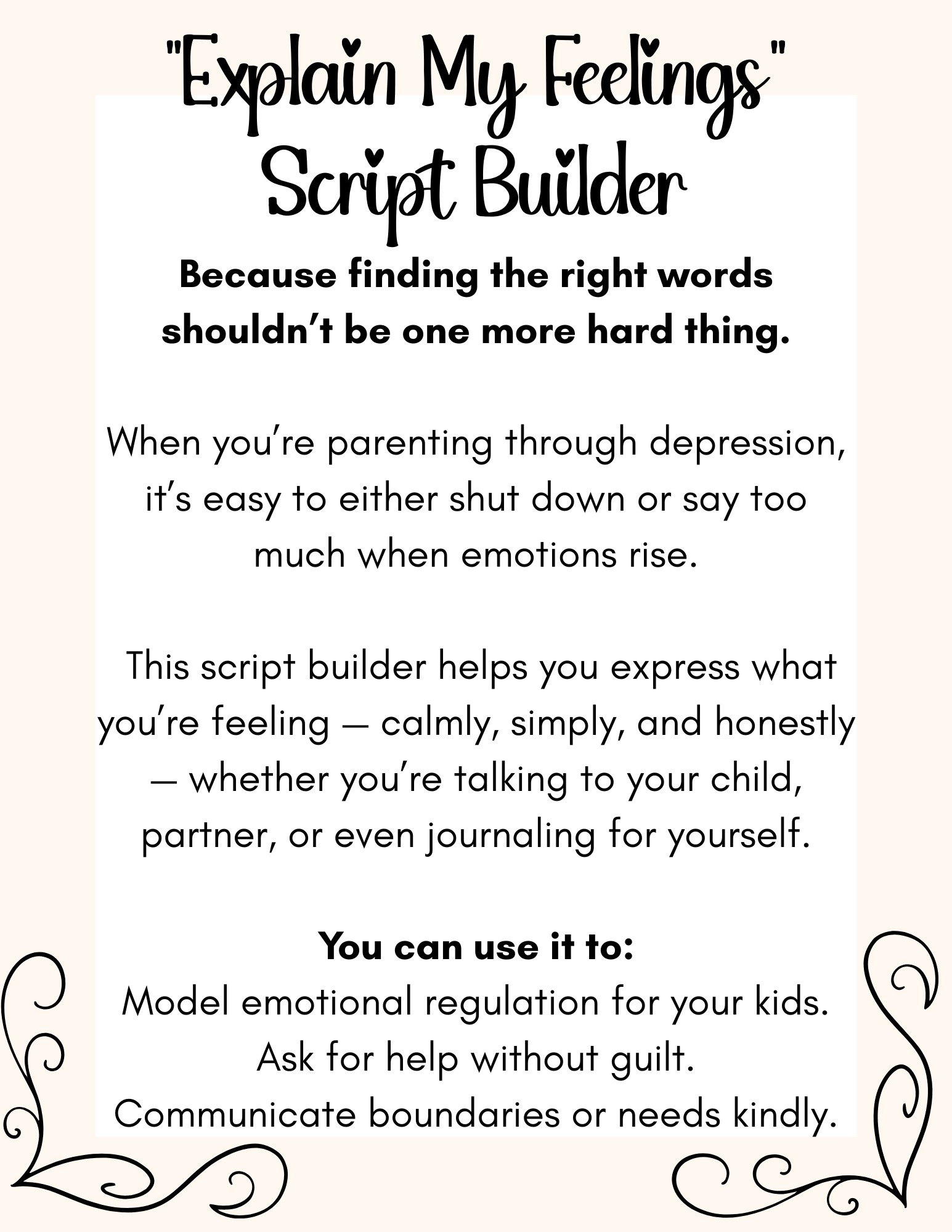 The “Explain My Feelings” Script Builder is a transformative tool designed to help moms struggling with depression or anxiety express their emotions with clarity. It equips you with the language to communicate your feelings honestly, fostering confidence, connection, and improved communication within your family.
